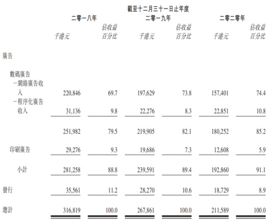智通财经APP了解到,主要面向香港市场的新传企划对自己的定位是一家数码媒体公司,主要通过数码媒体平台向广告商(包括跨国品牌所有者、广告代理公司至中小企等)提供综合广告解决方案,旗下拥有不同的文化品牌(包括新假期(Weekend Weekly)、东方新地(Oriental Sunday)、经济一周(Economic Digest)及新Monday(New Monday / NM+)),囊括多元化的兴趣领域制作及发行内容,并进行广告投放以形成收益。