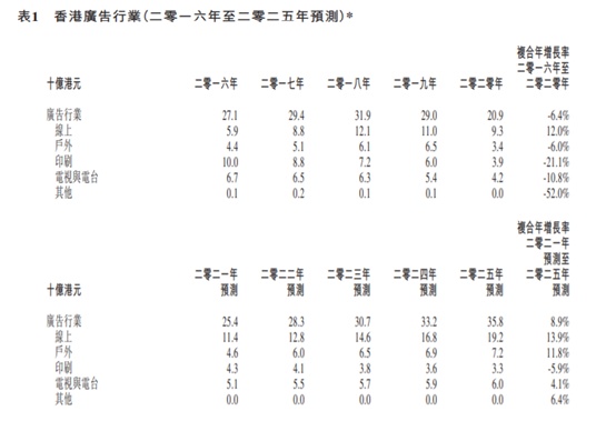智通财经APP了解到,近年以来,由于香港企业需要减少非必要的开支以应付经济及营商环境恶化所带来的不利影响,对广告开支的需求逐渐减少。另一方面,公司也需要更多时间来消化社会动荡及新冠疫情带来的变化,以便调整广告策略,获得更具成本效益的结果,从而进一步推迟2020年的整体广告支出。因此,香港广告行业于2020年录得209亿港元,较2019年的290亿港元下降28.2%,复合年增长率为负6.4%。