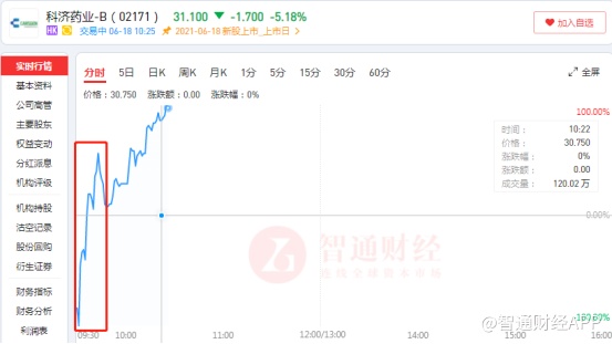 智通财经APP观察到,科济药业-B(02171)在6月17日暗盘开报39.8港元,收报28.3港元,较招股价跌13.72%,每手蚀2250港元。18日,科济药业开盘即大跌,早盘盘中股价较发行价最大跌幅达到18.90%,报价26.60港元。