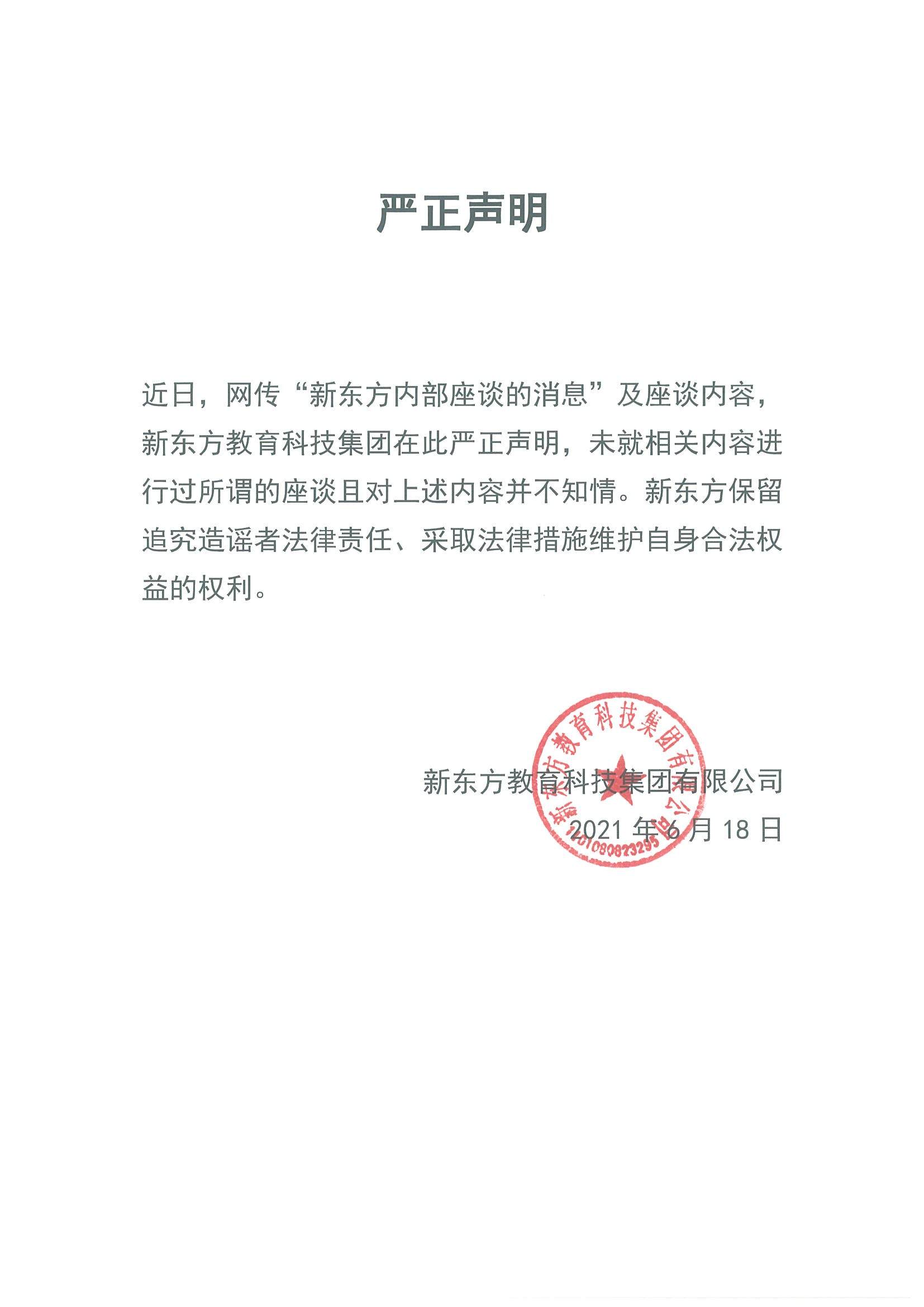 智通财经APP获悉,新东方(09901)官方发布声明称,网传“新东方内部座谈的消息”及座谈内容不实,公司未就相关内容进行所谓的座谈且对上述内容并不知情。新东方保留追究造谣者法律责任、采取法律措施维护自身合法权益的权利。