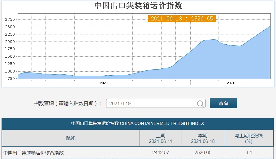 智通财经APP获悉,6月18日,上海航运交易所公布最新的出口集装箱运价指数显示,中国出口集装箱指数(CCFI)2526.65点,比上周涨3.4%创出历史新高,其中美东航线比上周升7.9%;美西航线升4.5%;欧洲航线升4.3%。另外,上海出口集装箱指数(SCFI)3748.36点,创出历史新高,相比上周上涨44.43点,涨幅1.2%,相比去年最低点818点,大涨358%。