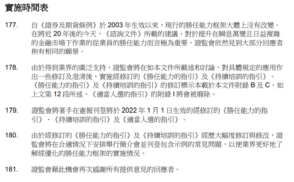 证监会将着手在宪报刊登将于 2022 年 1 月 1 日生效的经修订的《胜任能力的指引》、《持续培训的指引》及《适当人选的指引》。