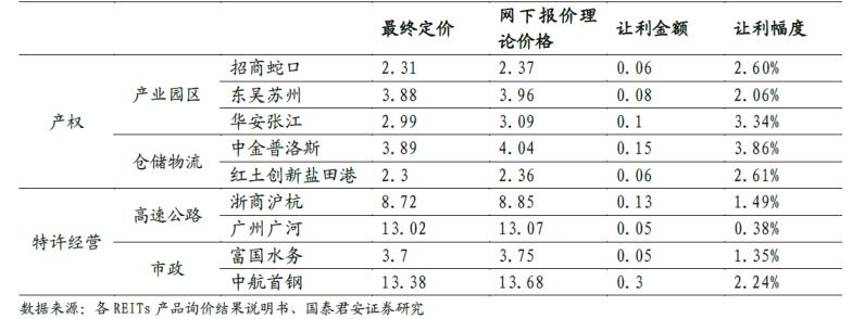 据国泰君安研报分析称,按照网下投资者报价的中位数与加权平均数的孰低者定义为REITs产品的网下报价的价格,统计发现最终REITs实际的定价均低于理论的网下报价的价格,显示首批REITs产品在定价上为二级市场做了一定的让利,平均让利幅度为2.22%。