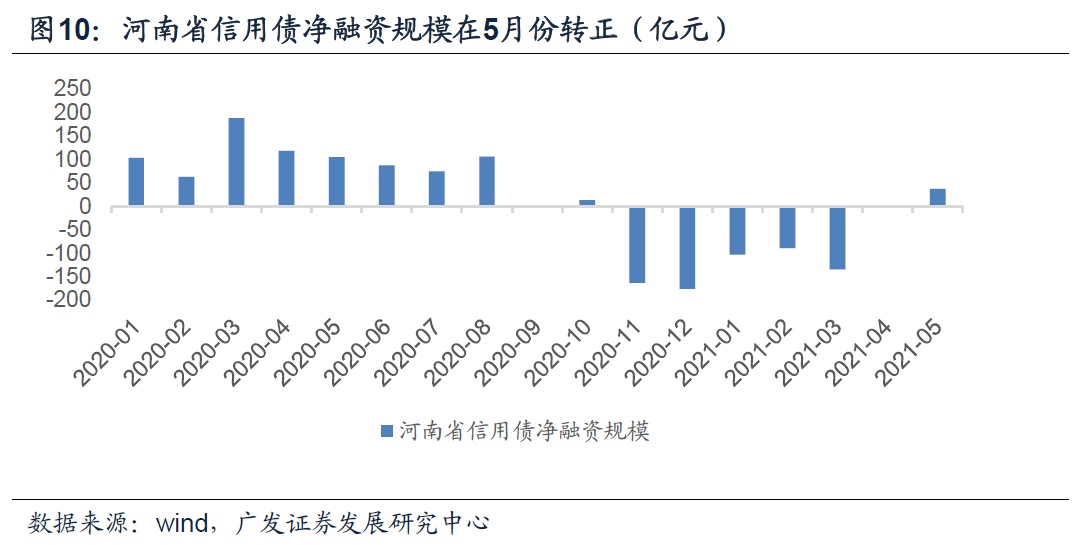 第二组数据是5月份河南省企业债券净融资规模在2020年11月永煤事件发生后重新回归正增长,信用分层现象有所缓解。