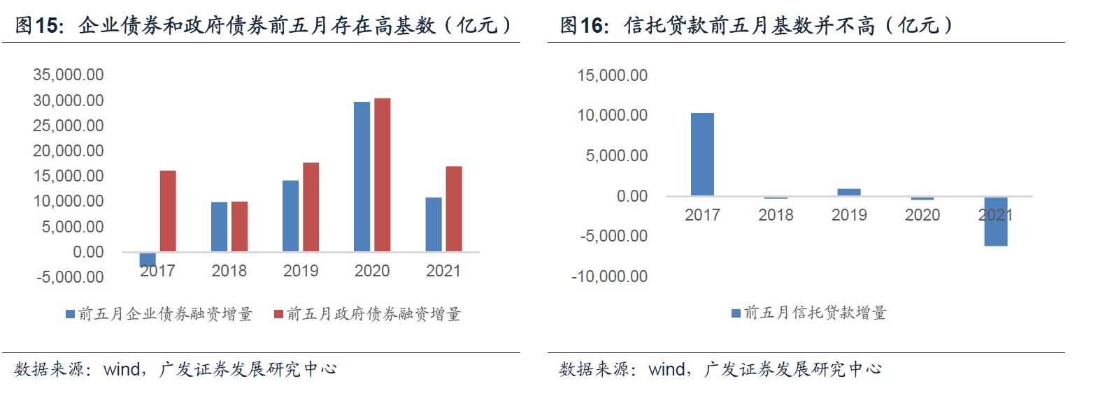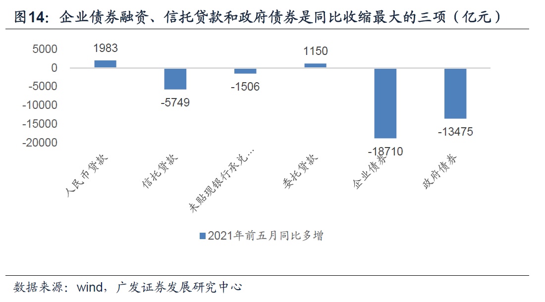 多数研究认为主要由高基数所致。但从社融分项来看,前五月社融收缩最主要的三个类别是企业债券融资、政府债券融资和信托贷款,同比分别少增1.87万亿元、1.35万亿元与0.57万亿元。