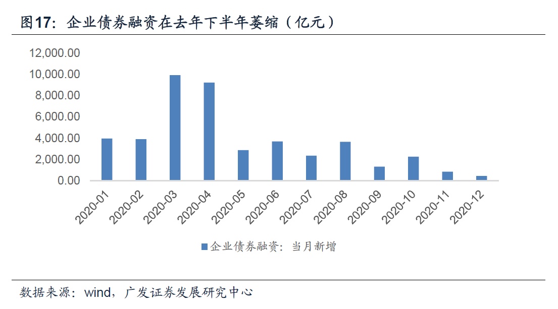 一是因为部分融资项的高基数效应在下半年会消失。如上半年快速收缩的债券融资,下半年将迎来边际的改善,且因为去年四季度发生了永煤违约事件,信用债融资明显缩量,高基数反而变为了低基数。