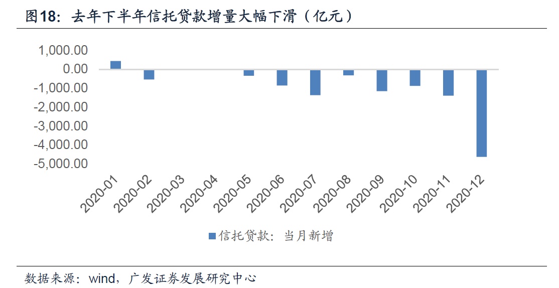四是因为监管压力分布上存在错位效应,去年上半年存在稳增长诉求,压降融资类信托主要集中在了年末,去年下半年信托贷款大幅负增长,形成了低基数。