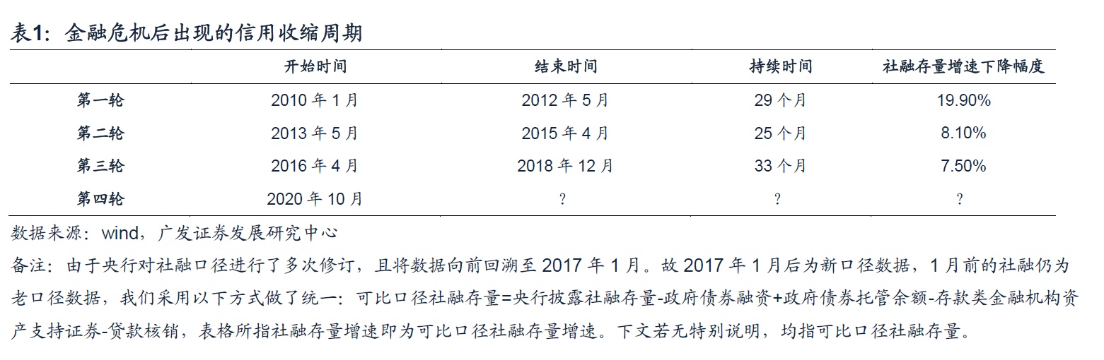 从持续时间来看,金融危机以后出现的三轮完整的信用收缩周期,持续时间分别为29个月、25个月与33个月,而本轮信用收缩周期从2020年10月份开始,即使算到年末,也仅有15个月,持续时间偏短。