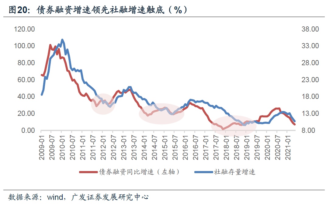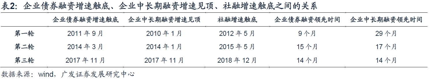 从经验规律看,债券融资增速触底和企业中长期融资增速见顶是社融底部出现之前的两个坐标。前者至少领先社融9个月,后者至少领先社融13个月。