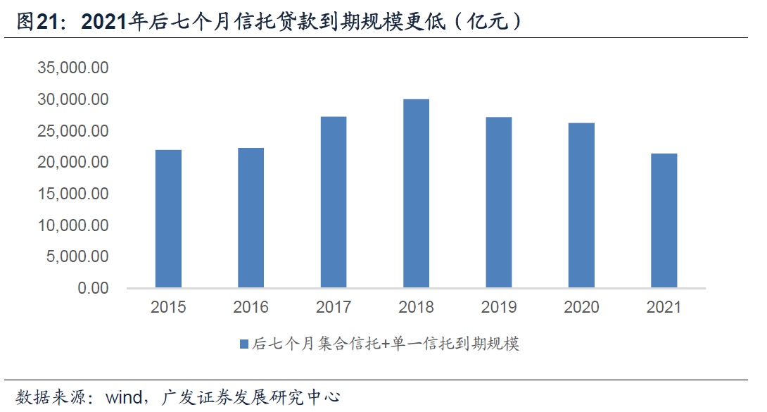 原因是稳增长压力较小的情况下,社融调结构和强监管诉求提升,信托贷款新发量可能会低于去年,但以集合资金信托+单一信托到期规模来看,2020年后七个月信托到期规模为2.63万亿元,今年后七个月信托到期规模为2.14万亿元,少了4900亿元,到期的压力更小,全年信托贷款增量可能和去年全年类似。
