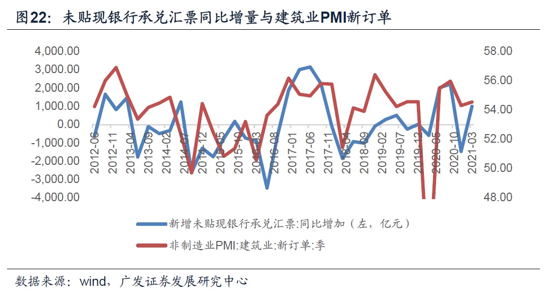 原因是票据结算中有相当一部分是与建筑行业相关,未贴现银行承兑汇票的同比变化与建筑业PMI的新订单指数有较好的正相关性,建筑行业更高的订单规模对应更强的结算需求,会使票据同比增量更高。