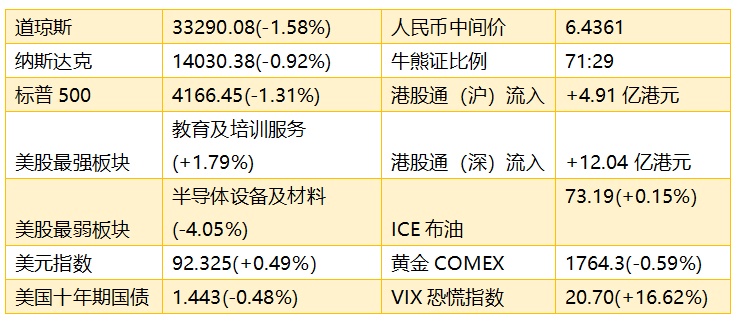 1、上周末美股收盘全线下跌,纳斯达克综合指数跌130.97点,跌幅0.92%,报14030.38点;道琼斯指数跌533.37点,跌幅1.58%,报33290.08点;标普500指数跌55.41点,跌幅1.31%,报4166.45点。港股ADR跟随美股大跌,按比例计算,收报28554点,跌246.66点或0.86%。