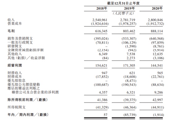 招股书显示,2018-2020年,公司收入分别为25.4亿、27.81亿和28亿。同期利润分别为5.7万,负8573.9万和负191.4万。