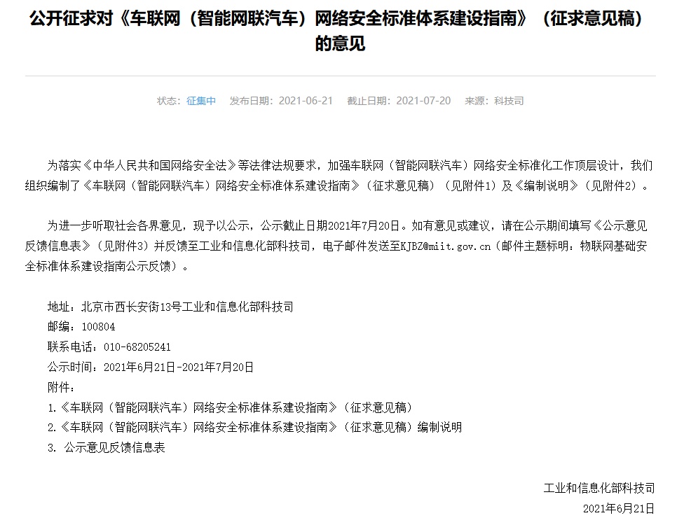 智通财经APP获悉,6月21日,工信部就《车联网(智能网联汽车)网络安全标准体系建设指南》公开征求意见。相关文件指出,伴随汽车网联化发展,网络攻击威胁加速向车端、车联网平台蔓延,车联网网络安全事件不仅影响公民隐私、财产和生命安全,甚至可能危害社会安全和国家安全。立足当前车联网网络安全面临的形势和挑战,制定车联网(智能网联汽车)网络安全标准体系框架,加强跨行业、跨领域标准制定工作的统筹协调,提升车联网(智能网联汽车)网络安全标准化水平,强化标准对车联网安全整体支撑作用,为车联网产业健康有序发展保驾护航。