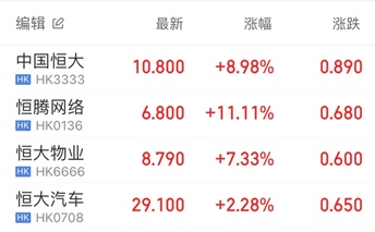 智通财经APP获悉,6月21日,恒大旗下四只股票全线暴涨。截至收盘,中国恒大(03333)大涨8.98%,恒大物业(06666)大涨7.33%,恒腾网络(00136)大涨11.11%,恒大汽车(00708)涨2.28%。