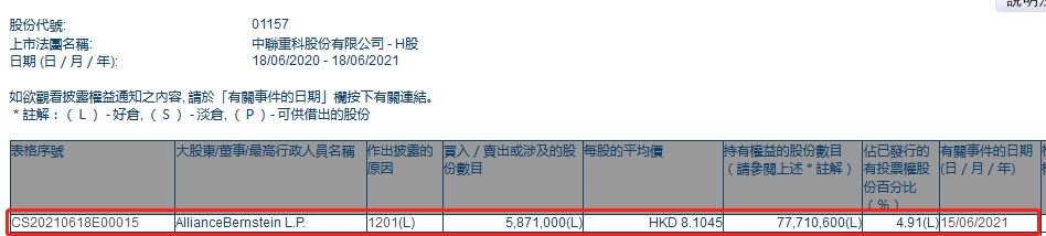 智通财经APP获悉,香港联交所最新资料显示,6月15日,AllianceBernstein L.P.减持中联重科(01157)587.1万股,每股作价8.1045港元,总金额约为4758.15万港元。减持后最新持股数目为7771.06万股,最新持股比例为4.91%。