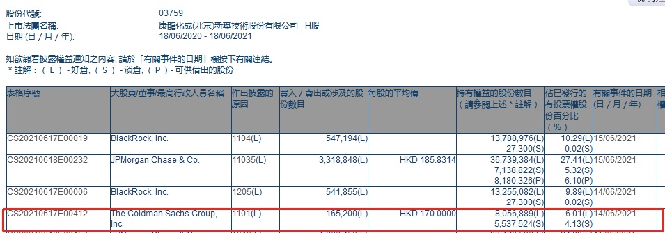 智通财经APP获悉,香港联交所最新资料显示,6月14日,高盛增持唐龙化成(03759)16.52万股,每股作价170港元,总金额为2808.4万港元。增持后最新持股数目约为805.69万股,最新持股比例为6.01%。