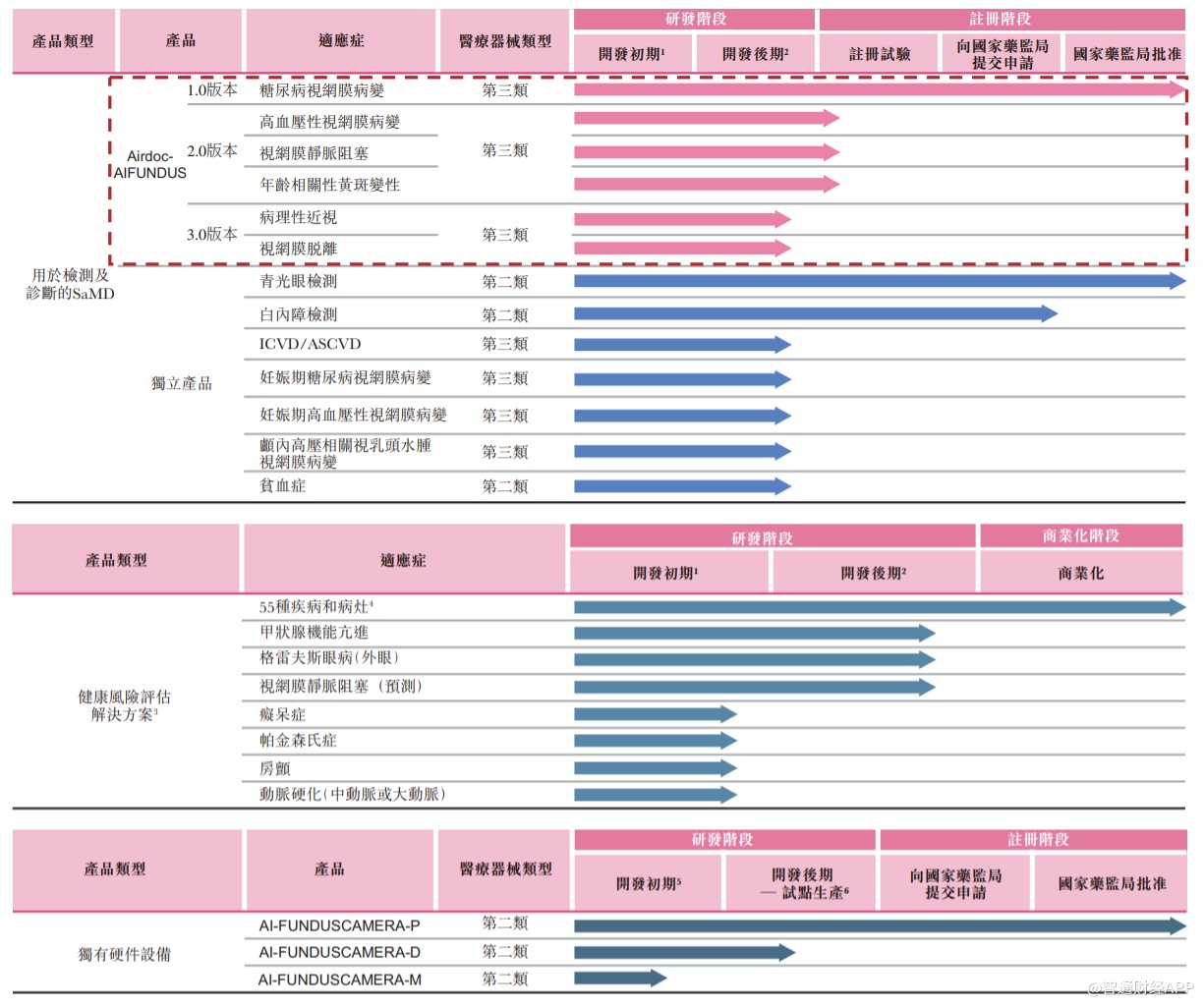 旗下产品Airdoc-AIFUNDUS(1.0)是一款人工智能医疗器械软件(SaMD),获批用于辅助诊断糖尿病视网膜病变,为同类产品中首个获得国家药监局第三类医疗器械证书的医疗器械。此外,公司已开发出一条丰富的产品管线,包含其他SaMD及健康风险评估解决方案,可解决在医院、社区诊所、体检中心、保险公司、视光中心及药房等场景的全人群用户对健康服务的各种需求。