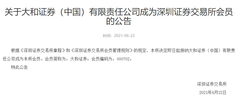 智通财经APP获悉,6月22日,深交所发布公告,即日起接纳大和证券(中国)有限责任公司和星展证券(中国)有限公司成为本所会员。会员编码分别为000702和000703。