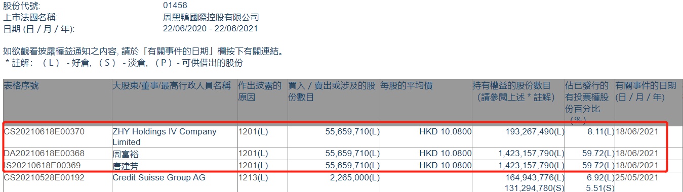 智通财经APP获悉,香港联交所最新资料显示,6月18日,ZHY Holdings IV Company Limited减持周黑鸭(01458)5565.971万股,每股作价10.08港元,总金额约为5.61亿港元。减持后最新持股数目约为1.93亿股,最新持股比例为8.11%。据悉,ZHY Holdings IV(本次减持的主体)是唐建芳及其他自然人老股东共同的持股实体,这次大宗包括了部分股东的少量减持,以满足其个人资产配置的需求,本次交易对周富裕的实控地位没有影响。公司的运营一切正常,管理层对业务发展和实现今年的目标充满信心。