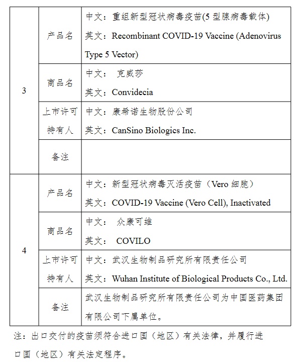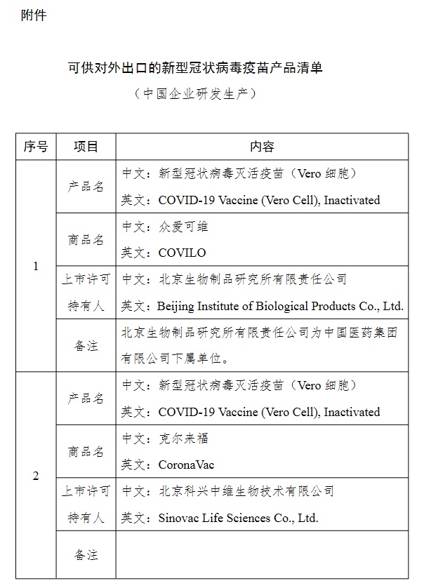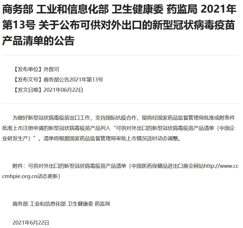 智通财经APP获悉,6月22日,商务部同工信部、卫健委、药监局联合发布《关于公布可供对外出口的新型冠状病毒疫苗产品清单的公告》。《公告》指出,为做好新型冠状病毒疫苗出口工作,支持国际抗疫合作,现将经国家药品监督管理局批准或附条件批准上市注册申请的新型冠状病毒疫苗产品列入“可供对外出口的新型冠状病毒疫苗产品清单(中国企业研发生产)”。清单将根据国家药品监督管理局审批上市情况适时动态调整。