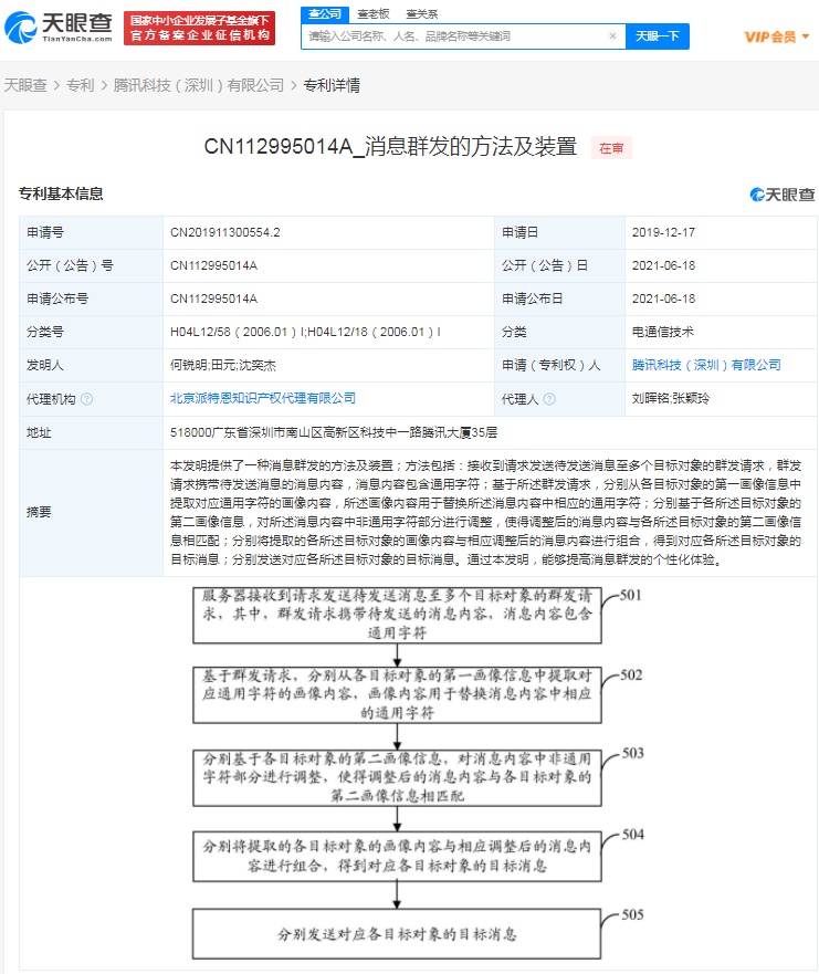 天眼查App显示,近日,腾讯科技(深圳)有限公司(00700)公开“消息群发的方法及装置”发明专利,公开号为CN112995014A,申请日期2019年12月。