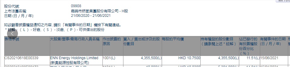 智通财经APP获悉,香港联交所最新资料显示,6月15日,新奥能源(02688)首次买入嘉兴燃气(09908)435.55万股,每股作价10.75港元,总金额约为4682.16万港元,持股比例为11.51%。