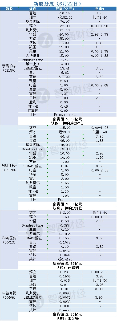 智通财经APP获悉,奈雪的茶(02150)、和黄医药(00013)、归创通桥-B(02190)、中骏商管(00606)正在招股中。截至6月22日,富途、辉立、耀才等合计分别为其借出近1060.81224亿港元、近411.68亿港元、近6.4176亿港元及0.4453亿港元;其中,奈雪的茶、归创通桥-B分别超购逾207倍、159倍,和黄医药已超购,中骏商管未足额。