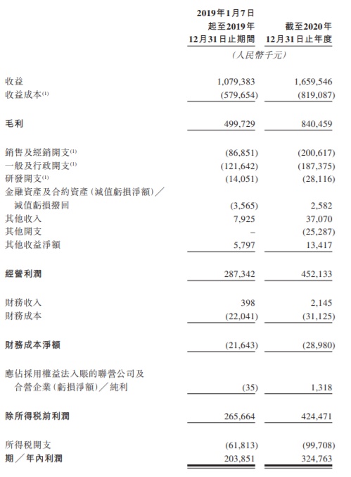 招股书显示,2019年1月7日起至2019年12月31日止期间及截至2020年12月31日止年度,悠可集团收益分别10.79亿元及16.60亿元;毛利润分别为5.0亿元及8.4亿元;净利润分别为2.04亿元及3.25亿元。