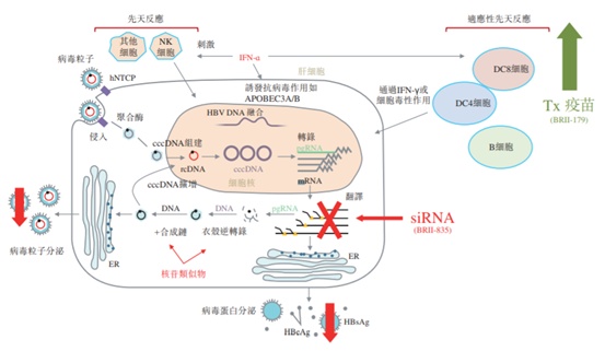 公司研发管线中,核心创新型产品为BRII-179(HBV特异性B细胞及T细胞治疗性免疫蛋白药物)。同时公司也在积极开发BRII-835(靶向HBV的siRNA药物),以实现通过联用疗法实现乙肝的功能性治愈。值得强调的是,目前BRII-835 -- siRNA药物的高度差异化的创新研发备受国际学界关注。