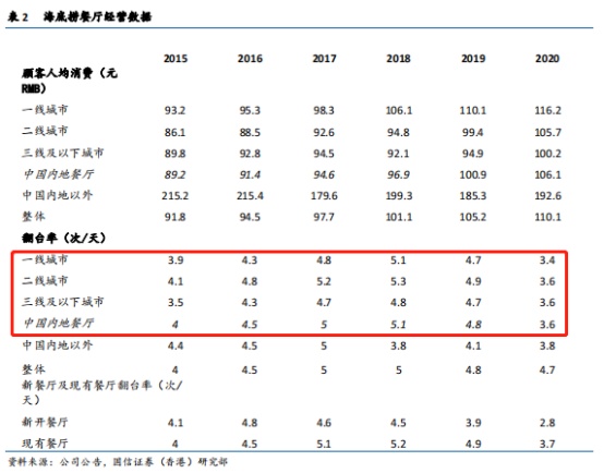 其二,5月初,大摩发布研究报告,其中引述海底捞管理层透露信息,今年4月份公司旗下餐厅整体翻台率低于3次,仅为2019年同期的约70%水平,环比3月份的3.5-3.7次亦有所下滑,表现显著低于市场预期;今年“五一”长假期间,海底捞整体翻台率约4.5-5次,也仅为2019年同期的约70%-75%。
