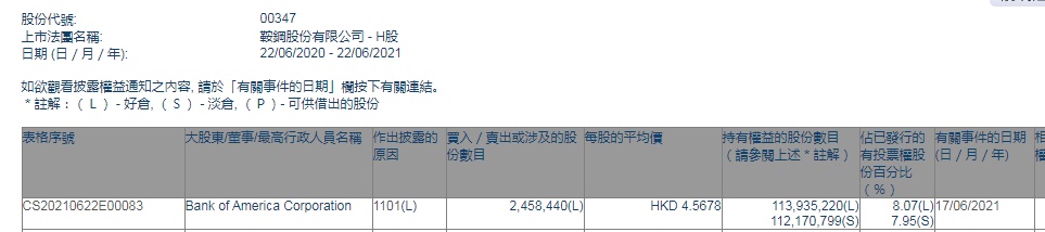 智通财经APP获悉,香港联交所最新资料显示,6月17日,美国银行增持鞍钢股份有限公司(00347)245.844万股,每股作价4.5678港元,总金额约为1122.97万港元。增持后最新持股数目约为1.139亿股,最新持股比例为8.07%。