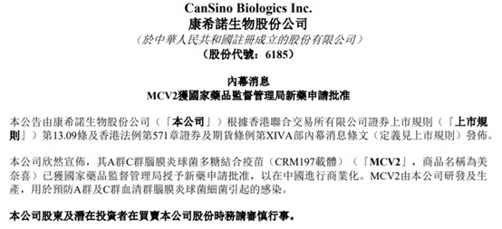 6月23日午间,临时停牌的康希诺生物在港交所披露公告称,其A群C群脑膜炎球菌多糖结合疫苗(CRM197载体)(MCV2,商品名称为“美奈喜”)已获国家药品监督管理局授予新药申请批准,以在中国进行商业化。MCV2由该公司研发及生产,用于预防A群及C群血清群脑膜炎球菌细菌引起的感染。