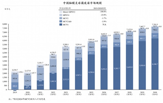 从市场角度来看,国内脑膜炎球菌疫苗市场预计由2019年22亿元增加至2030年的77亿元,年均复合增长率为12.1%,增长原因主要是由于非免疫规划脑膜炎球菌单价较高,相对多糖疫苗适用人群更广,总体销售额较大。