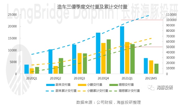 从累计交付数据来看,蔚来突破10万台,小鹏和理想分别突破5万台,小鹏始终领先理想。