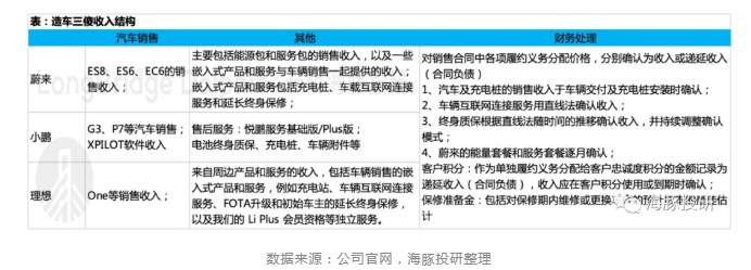 因此,这些新能源车公司会根据销售合同中的各项履约义务去分配合同的销售金额,合同总金额中包含裸车销售和增值(电池/充电桩、车辆售后/保修、车联网)服务两部分,增值收入则是要分配在相应的用车周期内。