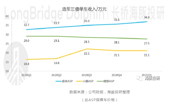 蔚来交付量和ASP都是最高,虽然交付量的领先程度并不高,但收入体量基本是小鹏和理想的收入之和。同时从收入结构来看,蔚来汽车销售之外的收入贡献度也更高。