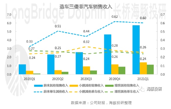 按照累计交付量来计算非汽车销售收入的单车收入,2021年一季度,蔚来存量车单车贡献约6000元收入(一年2.4万/车),小鹏和理想则分别为0.24万元和0.26万元,年化约1万元。蔚来在汽车销售之外的服务等方面的变现能力很强。