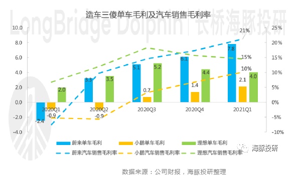 (4)单车毛利和毛利率:蔚来突破阈值快速爬升,小鹏最低,理想最具成本优势