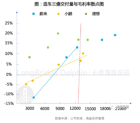 从造车三傻交付量和毛利率的散点图可以看出来: