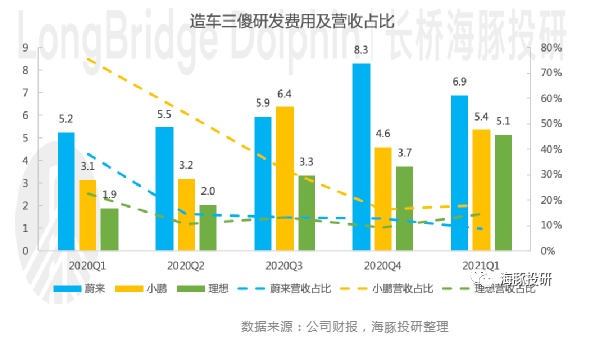 研发投入方面,在收入体量不占优的情况下,小鹏的研发费用率是最高的,2021年一季度研发费用率18%(蔚来和理想分别为9%、14%);