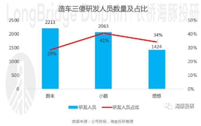 另外,海豚君整理了三家车企研发人员的情况,截止2021年12月31日,在营收体量不及蔚来一半的情况下,小鹏汽车研发人员数量直追蔚来,研发人员占比高达41%,充分说明小鹏对研发的重视。