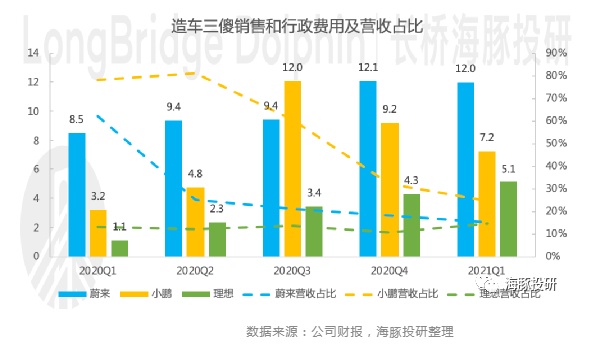 (6)销售和行政费用:蔚来最重营销,小鹏开始“直营+经销”模式