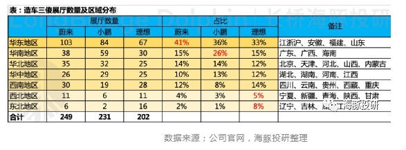 1.截止目前公司官网披露数据,蔚来以249家展厅居首,小鹏汽车231家次之,理想汽车202家居末