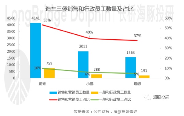 销售及行政员工数量方面,明显高于传统车企,蔚来尤甚。截止2020年12月31日,蔚来的销售人员数量高达4141人,占比超53%,小鹏和理想的销售人员占比虽然没有蔚来高,但40%和37%也是远高于传统车企的。