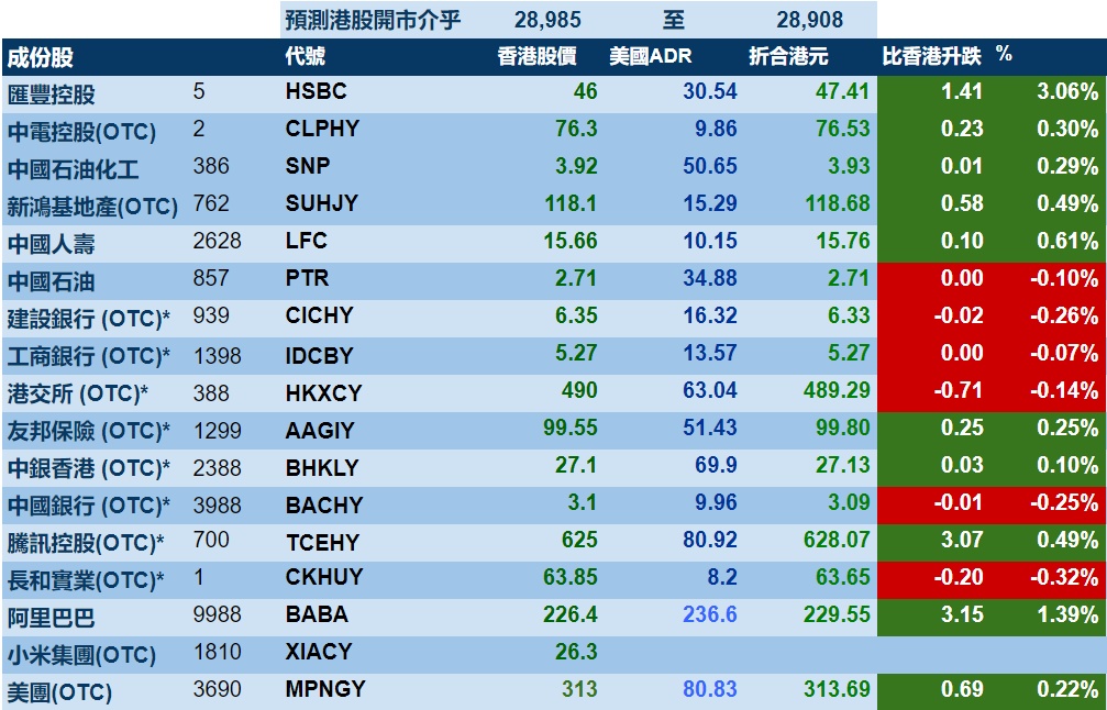 智通财经APP获悉,周三美股三大指数收涨,港股ADR指数上涨,按比例计算,收报28985点,涨167.82点或0.58%。