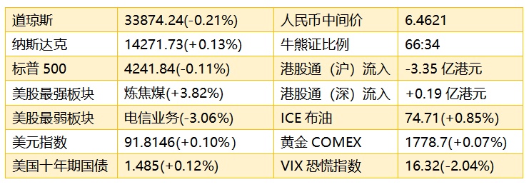 1、隔夜美股纳斯达克综合指数涨18.46点,涨幅0.13%,报14271.73点,创收盘历史新高;道琼斯指数跌71.34点,跌幅0.21%,报33874.24点;标普500指数跌4.6点,跌幅0.11%,报4241.84点。港股ADR指数上涨,按比例计算,收报28985点,涨167.82点或0.58%。