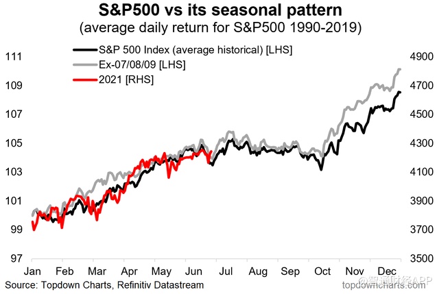 首先来看标准普尔500指数的走势,下图中的季节性线显示了标准普尔500指数的日均变化,其今年以来似乎基本上遵循了季节性走势,尽管没有人明确解释清楚为什么6-11月股市往往表现不佳。