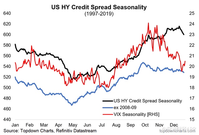 下一张图表则显示了美国高收益信贷利差(信贷风险定价)和VIX(股票风险定价)水平的平均路径。从历史上看,第三季度的风险定价往往会向上漂移,基本上与目前股市表现如出一辙。