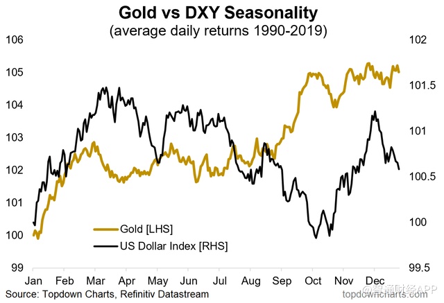 更令投资者震惊的是,从6月、7月到11月,黄金往往会反弹,反之,美元在同一时期往往会下跌。实际上,从季节角度来看,美元往往在3月、4月左右达到峰值。